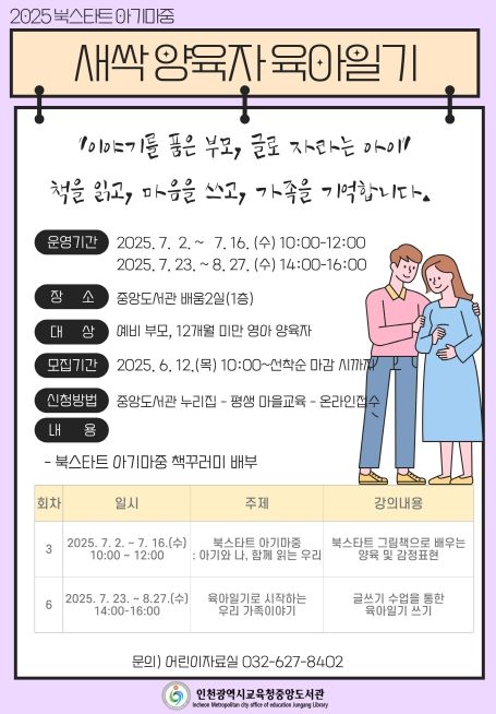 (아름다운교육신문) 인천광역시교육청중앙도서관은 임신부와 초기 양육자를 위한 ‘북스타트 새싹 양육자 육아일기’ 프로그램 참여자를 모집한다.