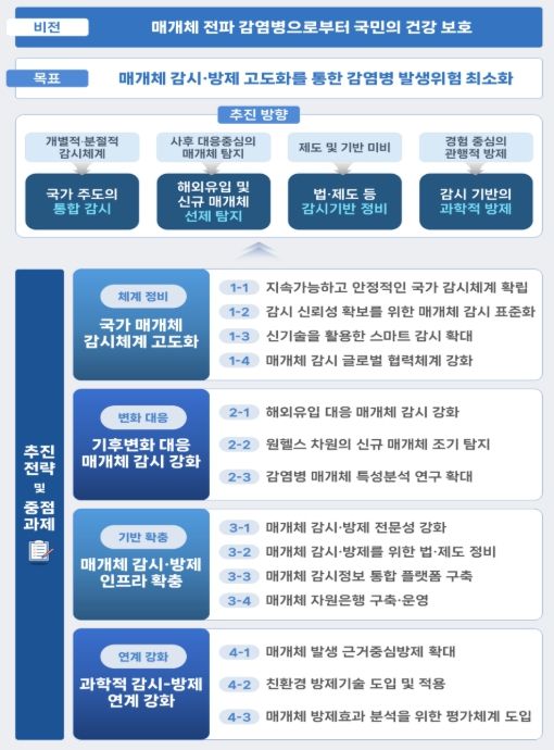 본 계획은 국가 매개체 감시체계 고도화, 기후변화 대응 매개체 감시 강화, 매개체 감시·방제 인프라 확충, 감시와 방제의 연계 강화를 위한 향후 5년간의 추진 전략을 담고 있다.