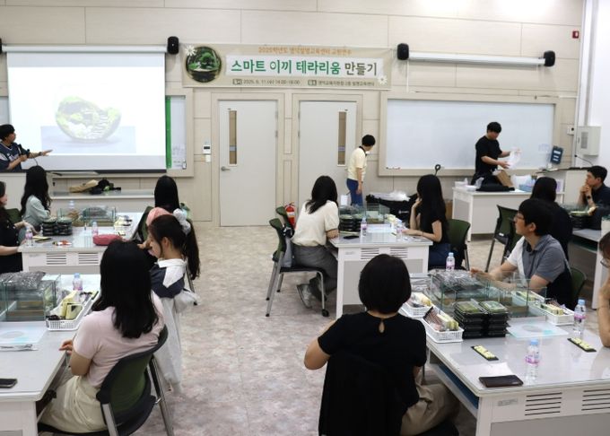 교원들은 이끼의 생태적 특성과 테라리움의 기본 원리에 대해 학습하고, 직접 스마트 테라리움 제작에 참여하며 실습 중심의 연수를 진행했다. 특히 자동 가습 장치 제작과 그 작동 원리를 익히는 과정을 통해, 실생활과 연결된 창의 융합 수업의 실천 가능성을 체감할 수 있었다.