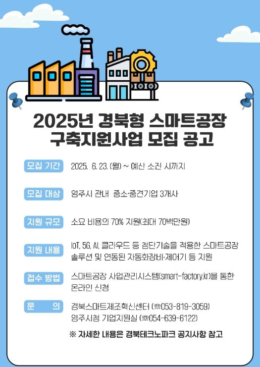 (아름다운교육신문) 영주시는 관내 중소기업의 제조 현장을 디지털화하기 위해 오는 6월 23일부터 ‘경북형 스마트공장(기초단계) 구축지원사업’ 참여 기업을 모집한다고 밝혔다.