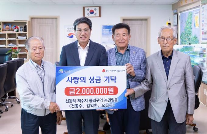 김돈곤 청양군수는 “신왕1리 몽리구역 주민 여러분의 이웃사랑 실천에 깊이 감사드린다”며 “기탁받은 성금은 꼭 필요한 이웃을 위해 소중하게 사용하겠다”라고 감사의 인사를 전했다.