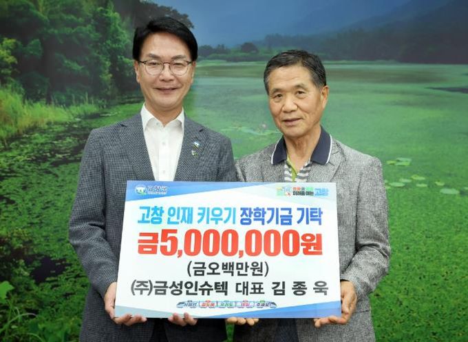 (아름다운교육신문) 고창군 신림면 출신 ㈜금성인슈텍 김종욱 대표 김종욱가 고창군장학재단에 500만원을 기탁하여 지역인재 육성을 위해 힘을 보탰다.
