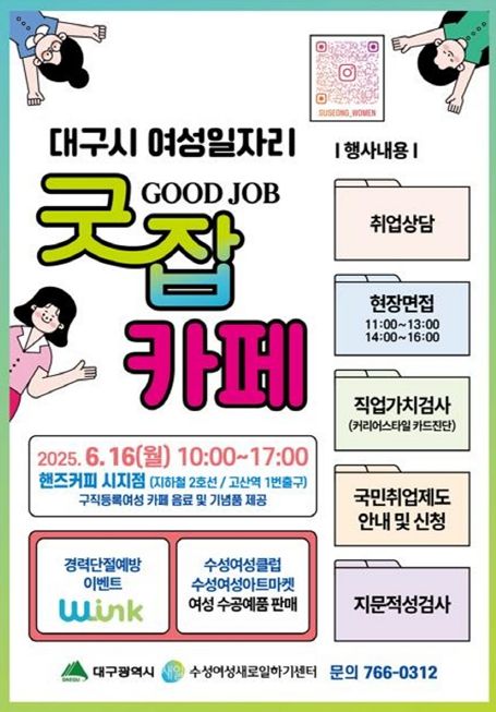 (아름다운교육신문) 대구광역시는 취업을 희망하는 경력단절 및 미취업 여성을 위해 ‘찾아가는 여성일자리 ‘굿잡(Good Job)’카페’ 행사를 오는 6월 16일 오전 10시부터 핸즈커피 시지점(도시철도 2호선, 고산역 1번출구)에서 운영한다.