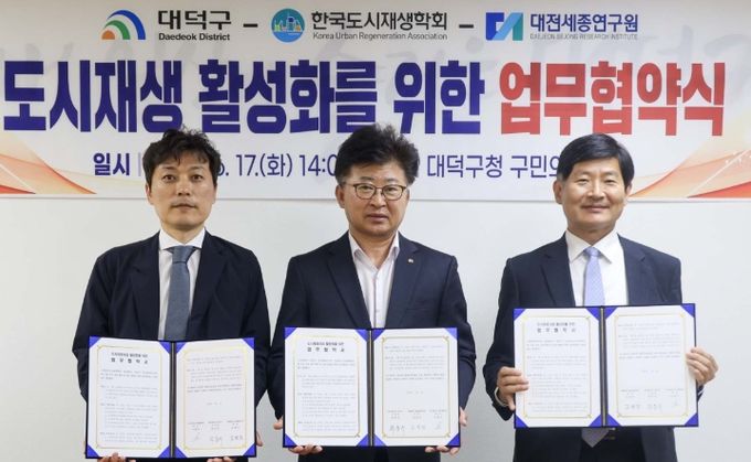 (아름다운교육신문) 대전 대덕구는 지난 17일, 한국도시재생학회(회장 이재우) 및 대전세종연구원(원장 김영진)과 함께 도시재생 활성화를 위한 상호협력 업무협약(MOU)을 체결했다고 밝혔다.