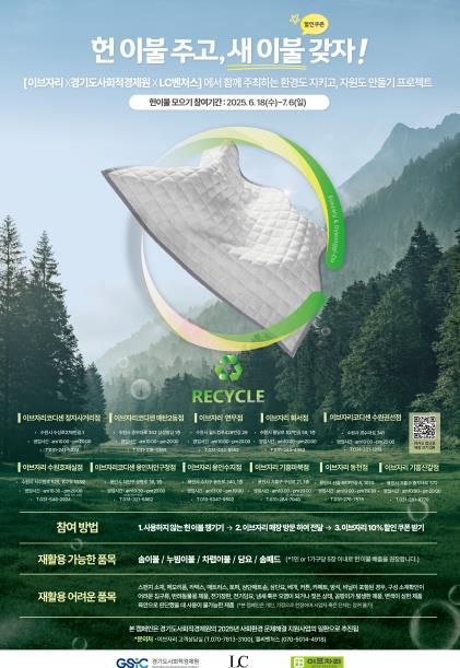 (아름다운교육신문) 경기도사회적경제원은 소셜벤처기업 ㈜엘씨벤쳐스, 침구 브랜드 ㈜이브자리와 함께 ‘경기도 헌 이불 자원순환 프로젝트’을 추진한다고 18일 밝혔다.