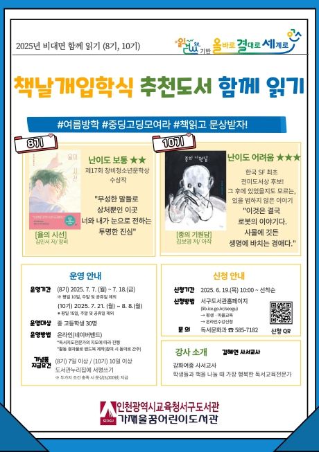(아름다운교육신문) 인천광역시교육청서구도서관은 여름방학을 맞아 중·고등학생을 대상으로 ‘비대면 함께읽기’ 프로그램 8기와 10기를 운영한다.
