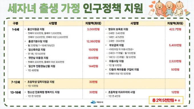 시는 자녀 나이에 따라 ▲출산지원금 3,000만 원 ▲출생기본수당(18년간) 1억 2,960만 원 ▲임신축하금 150만 원 ▲첫만남 이용권 800만 원 ▲임산부 친환경농산물 144만 원 ▲영유아 보육료 422.7만 원 ▲부모급여 5,400만 원 ▲아동수당 2,520만 원 ▲다둥이 육아용품비 50만 원 등 2억 5,446만 원을 지원하고 있다.