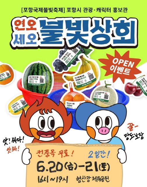 ‘연오세오불빛상회’는 포항의 대표 설화인 연오랑·세오녀 이야기를 바탕으로 한 포항을 대표하는 캐릭터인 ‘연오’와 ‘세오’를 친근하게 알리기 위해 기획된 부스로, 기존 홍보 방식을 탈피해 ‘과일가게’ 콘셉트로 꾸며질 예정이다.