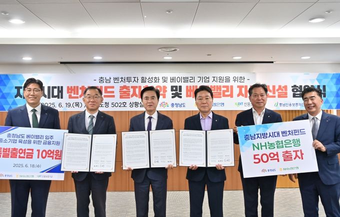 도는 19일 도청 상황실에서 김태흠 지사와 백남성 NH농협은행 부행장, 채병호 신용보증기금 상임이사가 참석한 가운데, 도내 벤처 투자 생태계 활성화 및 지역 기업 육성을 위한 ‘지방시대 벤처펀드 출자 확약 및 베이밸리 자금 협약식’을 개최했다.