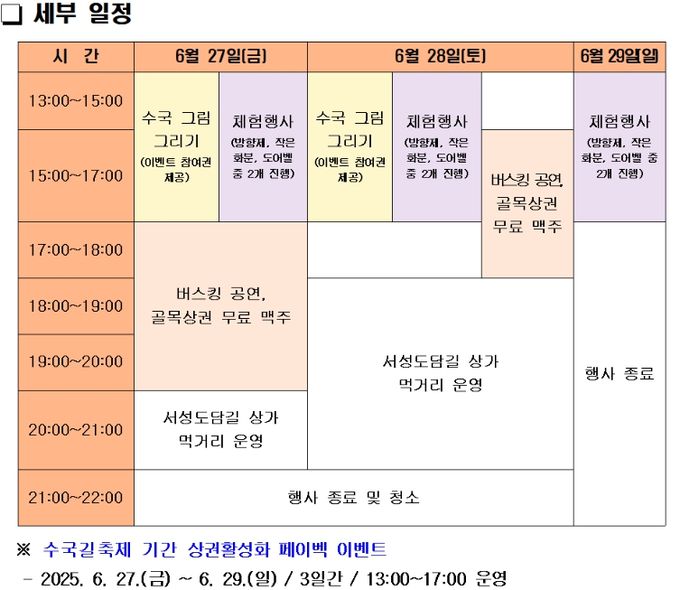 행사 첫날인 6월 27일 오후 1시부터 다양한 체험행사를 시작으로 수국 그림 그리기와 버스킹 공연이 이어지며, 저녁 시간에는 서성도담길 골목상권 조직화 축하를 위한 무료 맥주 공간과 먹거리 장터가 17시부터 20시까지 운영된다.