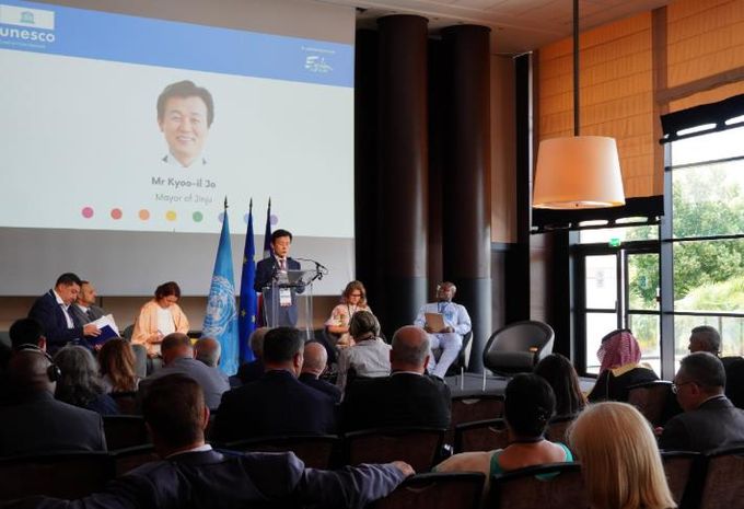 23일 첫날 진행된 시장 포럼 세션에서 조규일 진주시장은 ‘몬디아컬트(MONDIACULT) 2022 선언’과 ‘브라가 선언’을 문화정책에서 실현하기 위한 진주시의 노력'을 주제로 직접 영어 발표를 진행하며, 유네스코 창의도시로서 진주시가 실천해온 다양한 정책과 사례를 소개했다.