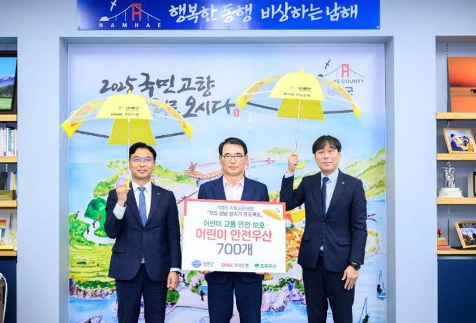 협약의 첫 실천 사업으로 BNK경남은행과 초록우산어린이재단은 야간이나 우천 시 운전자의 시야 확보로 어린이 교통사고 위험을 줄일 수 있는 어린이 안전 우산 700개를 남해군에 지원했다.