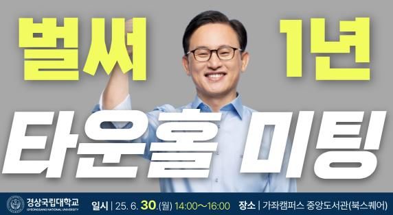 (아름다운교육신문) 경상국립대학교는 6월 30일 오후 2시 중앙도서관 북스퀘어에서 미래 고등교육 혁신과 대학 발전 방향을 모색하는 소통의 장 ‘총장-대학 구성원과의 타운홀 미팅’을 개최한다.