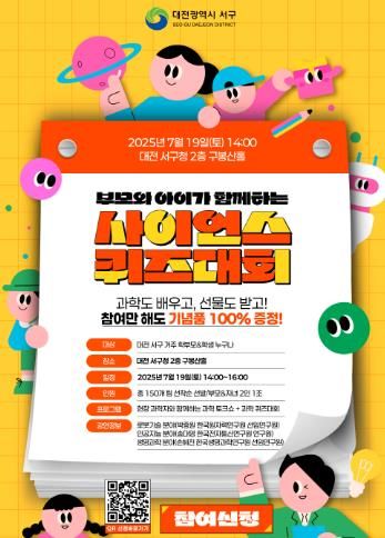 (아름다운교육신문) 대전 서구는 오는 7월 19일 오후 2시, 서구청에서 ‘부모와 아이가 함께하는 사이언스 퀴즈대회’를 개최한다고 밝혔다.