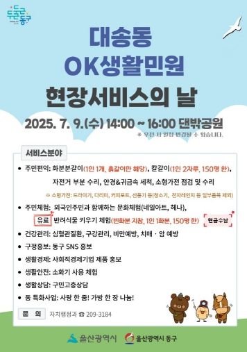 (아름다운교육신문) 울산 동구는 오는 7월 9일(수) 오후 2시부터 4시까지 댄밖공원에서 ‘대송동 OK생활민원 현장서비스의 날’ 행사를 개최한다.