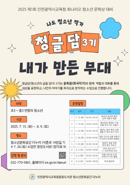 특히 본 프로그램은 청소년 문학 활동 ‘청글담(청소년의 글을 담다)’ 3기 과정으로, 참가자들은 창작한 희곡을 바탕으로 ‘2025 제1회 인천광역시교육청 희나리오 청소년 문학상’ 공모에도 도전할 예정이다.