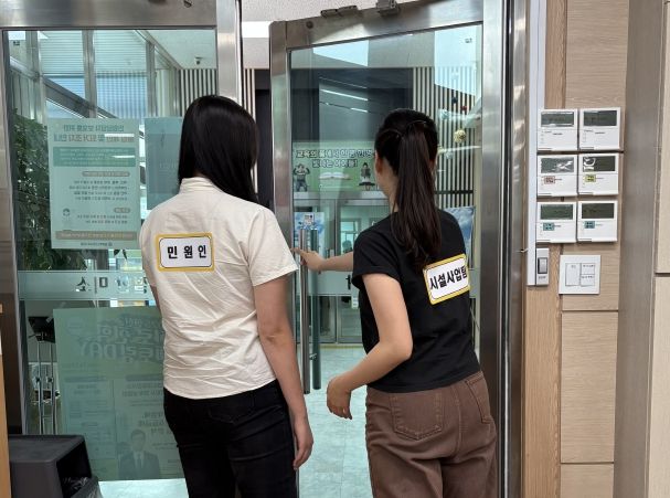 행정과 각 팀에서 직원들이 참여해 실제 상황을 가정한 시나리오에 따라 역할을 분담하고, ▴폭언‧폭행 시 녹음‧녹화 및 퇴거, ▴기물파손‧위협 시 경찰 신고, ▴타 민원인 대피 등 대응 절차를 실습했다.