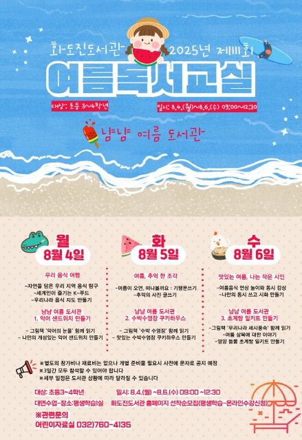 (아름다운교육신문) 인천광역시교육청화도진도서관은 여름방학을 맞아 오는 8월 4일부터 6일까지 초등학교 3~4학년을 대상으로 여름독서교실 ‘냠냠 여름 도서관’을 운영한다.