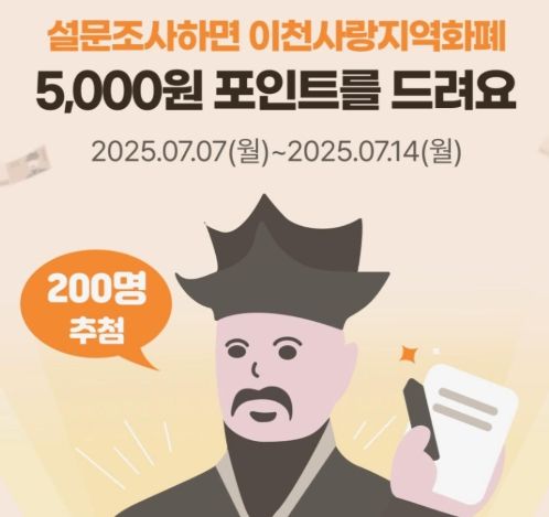 이천시는 설문 응답자 가운데 200명을 추첨해 이천사랑지역화폐 5,000원을 지급하고, 설문조사 참여 점주 300명에게는 3,000원을 지급하는 이벤트도 함께 진행한다. 경품 지급 및 추첨은 설문조사 플랫폼 기관인 ‘코나체인’에서 담당한다.