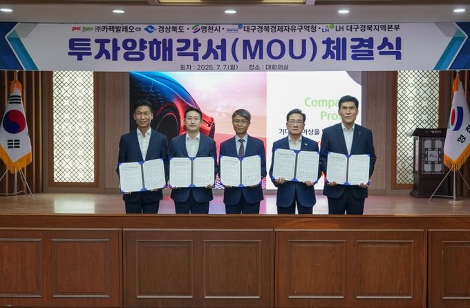 경상북도는 7일 영천시청에서 ㈜카펙발레오와 영천시, 대구경북경제자유구역청(DGFEZ), 한국토지주택공사(LH)와 함께 투자금액 1,600억원, 100명의 신규 고용 창출을 내용으로 하는 투자양해각서(MOU)를 체결했다.
