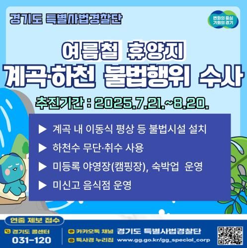 (아름다운교육신문) 여름 휴가철을 맞아 경기도가 7월 21일부터 8월 20일까지 도내 주요 계곡과 하천 등 휴양지에서 발생하는 불법행위를 집중 단속한다.