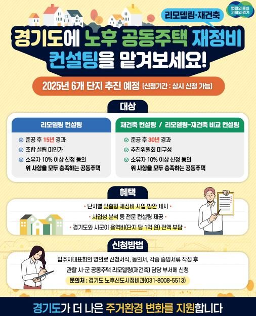 (아름다운교육신문) 경기도가 오래된 아파트 소유자들이 리모델링이나 재건축 여부를 객관적으로 판단할 수 있도록 컨설팅 비용 1억 원을 지원하는 ‘경기도 공동주택 재정비 컨설팅 사업’을 추진한다며 참여를 당부했다.