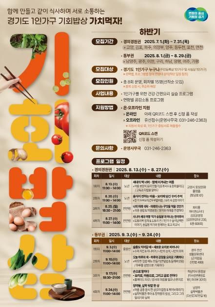 (아름다운교육신문) 경기도가 ‘2025년 1인가구 기회밥상’ 하반기 프로그램에 참여할 1인 가구를 모집한다.