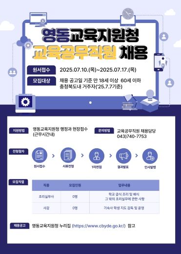 이번 모집 직종은 조리실무사, 사감 직종이며 최종 합격자는 영동교육지원청 내 공립학교에 배치되어 근무 할 예정이다. 응시자격, 채용절차 등은 영동교육지원청 누리집 알림마당 ' 채용정보에서 확인하거나 전화로 문의하면 된다.
