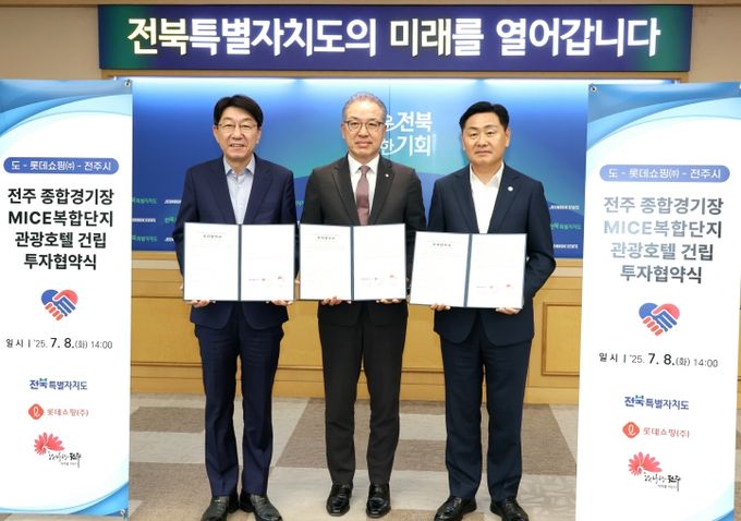 전북특별자치도와 전주시, 롯데쇼핑(주)은 8일 도청에서 총 1000억 원 규모의 롯데호텔 건립 및 수반되는 행정적 지원 등을 약속하는 ‘전주 종합경기장 MICE 복합단지 관광호텔 건립 투자협약(MOU)’을 체결했다.