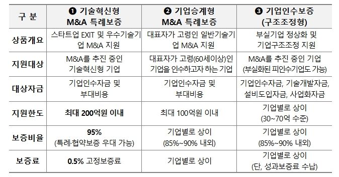 이에 중기부는 금년 1월부터 기술보증기금 내에 「인수합병(M&A)지원센터」를 설치하여 일반 인수합병(M&A) 지원은 물론, 자녀승계가 어려운 고령의 대표들에게 인수합병(M&A)을 통한 제3자 기업승계를 돕고 있다. 동 센터는 ▲인수합병(M&A) 거래정보망 운영, ▲중개지원, ▲인수합병(M&A) 파트너스 네트워크 구축, ▲인수합병(M&A) 보증, ▲기술보호(TTRS 등) 등 원활한 제3자 기업승계 서비스를 제공하고 있다.