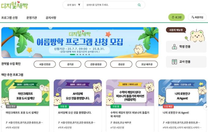 신청 방법은 7월 7일부터 8월 31일까지 상시 신청으로 여름방학 기간이며, 디지털새싹 누리집에서 원하는 프로그램을 선택하여 신청할 수 있다.