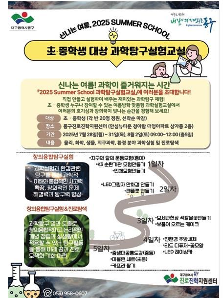 (아름다운교육신문) 대구 동구청은 여름방학을 맞아 관내 초‧중학생을 대상으로 2025 Summer School ‘과학탐구실험’ 진로체험 프로그램을 운영한다.