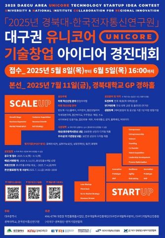(아름다운교육신문) 대구광역시는 오는 7월 11일, 경북대학교 글로벌플라자(경하홀)에서 경북대학교, 한국전자통신연구원(ETRI)과 함께 ‘2025년 대구권 유니코어 기술창업 아이디어 경진대회’를 개최한다.