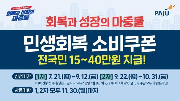 김경일 파주시장은 “올해 초에 우리 시가 경기도 최초로 지급했던 ‘민생회복 생활안정지원금’지급의 경험을 살려 선제적 TF 회의를 마치고 제반 사항을 준비 중이다”라며 “모든 시민이 소비쿠폰을 지급받을 수 있도록 최선을 다하겠다”라고 밝혔다.