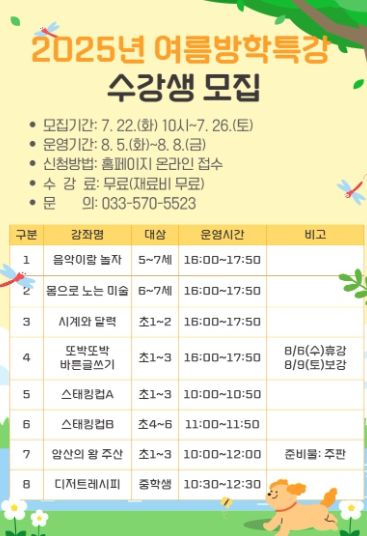 2025년 여름방학특강은 △음악이랑 놀자 △시계와 달력 △스태킹컵 △디저트 레시피 등 각각 4회씩 8개 프로그램으로 구성됐다.