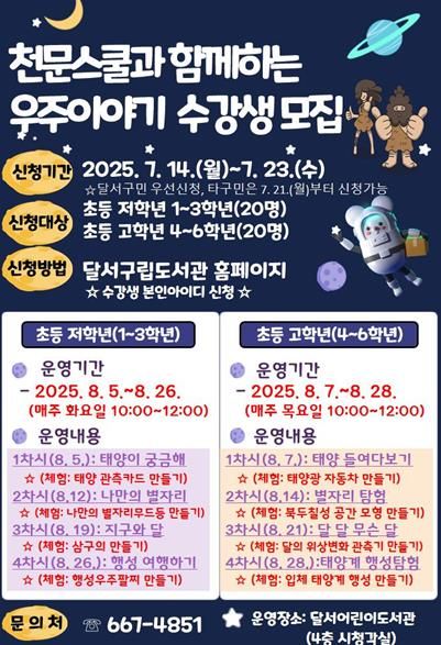이태훈 달서구청장은 “우주를 주제로 한 이번 신규 프로그램이 어린이들의 창의력과 과학적 호기심을 자극하는 계기가 되길 바라며, 여름방학을 더욱 특별하고 유익하게 보내는 시간이 되길 기대한다”고 말했다.