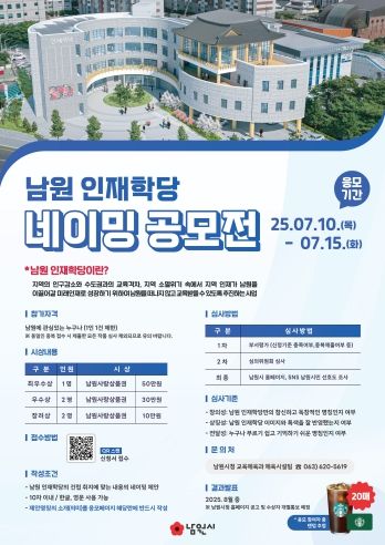 (아름다운교육신문) 남원시는 남원 인재양성 사업의 전환점이 될 남원 인재학당 네이밍 공모전을 실시한다.