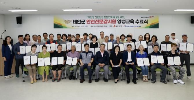 군은 지난 9일 태안문화원에서 교육생들을 비롯해 가세로 군수, 한국서부발전(주) 태안발전본부 안전경영실 산업안전부 최정용 부장, 고용노동부 서산출장소 서산고용센터 이강은 소장, 보령여성인력개발센터 유영미 관장, 건설산업안전보건교육센터 문천수 이사 등 40여 명이 참석한 가운데 ‘2025년 하반기 태안군 안전전문감시원 양성과정 수료식’을 갖고 교육생 35명 전원에게 안전전문감시원 수료증을 수여했다고 밝혔다.