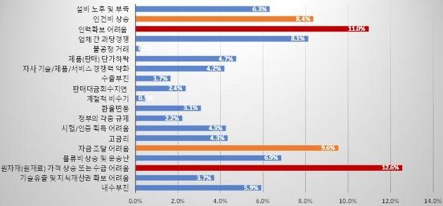 경영상 애로사항으로는 원자재 가격 상승 및 수급 어려움, 인력 확보의 어려움, 자금 조달의 어려움 순으로 애로사항이 크다고 조사됐다.