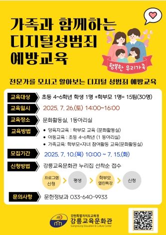 참가 신청은 7월 10일 오전 10시부터 7월 15일(화) 오후 5시까지 강릉교육문화관 누리집을 통해 선착순으로 15가족(총 30명)을 모집한다.