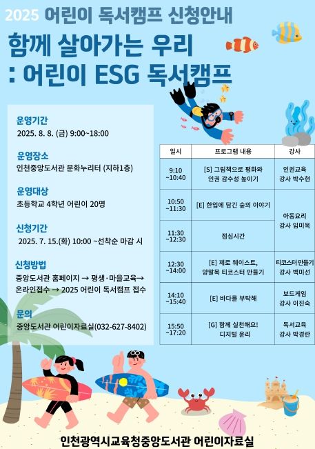 (아름다운교육신문) 인천광역시교육청중앙도서관은 8월 8일, 남동구 관내 초등학교 4학년 및 동 연령의 어린이를 대상으로 ‘어린이 ESG 독서캠프’를 개최한다.