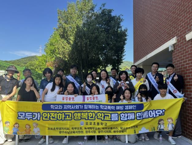행사에는 오포초등학교 교직원과 학생회, 학부모폴리스, 광주하남교육지원청 관계자, 광주경찰서 여성청소년계 경찰관 및 학교전담경찰관 등이 함께 참여해 등굣길 학생들에게 인사를 전하고, 학교폭력 예방 리플릿과 홍보물품을 배부했다.
