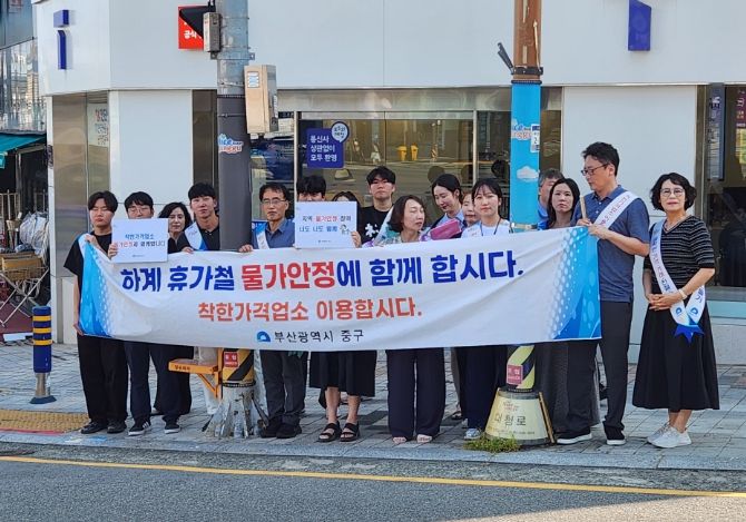 (아름다운교육신문) 부산 중구는 7월 8일 대청사거리에서 구청 직원 18명이 참석하여 휴가철 대비 물가안정 참여, 전통시장과 착한가격업소 이용, 『정직한 가격‧거래‧친절‧구매, 밝은 지역경제 만들기』실천 등을 위한 물가안정 참여 캠페인을 개최했다.