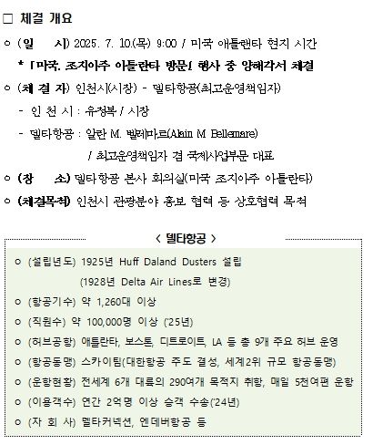 인천시는 이번 양해각서 체결에 따라 델타항공의 직항노선 확대에 필요한 행정적 지원을 아끼지 않을 계획이다.