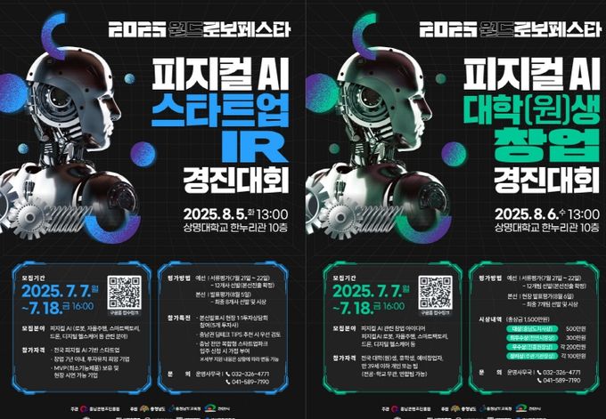 (아름다운교육신문) 충남콘텐츠진흥원은 오는 8월 5일 천안(상명대학교)에서 개최되는 ‘2025 월드 로보 페스타’의 주요 프로그램으로『피지컬AI 스타트업 IR 경진대회』와 『피지컬AI 대학(원)생 창업 경진대회』를 동시 개최하며 이에 참여할 참가팀을 모집한다고 밝혔다.