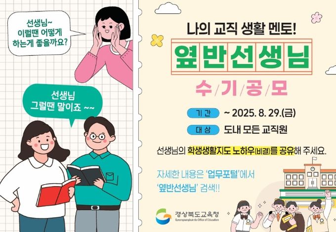 (아름다운교육신문) 경북교육청은 교육 현장에서 교사들이 겪는 생생한 생활지도 경험과 학교폭력 예방 사례를 공유하고, 교직의 보람과 가치를 함께 나누기 위해 ‘나의 교직 생활 멘토! 옆 반 선생님’이라는 주제로 수기 공모를 진행한다고 11일 밝혔다.
