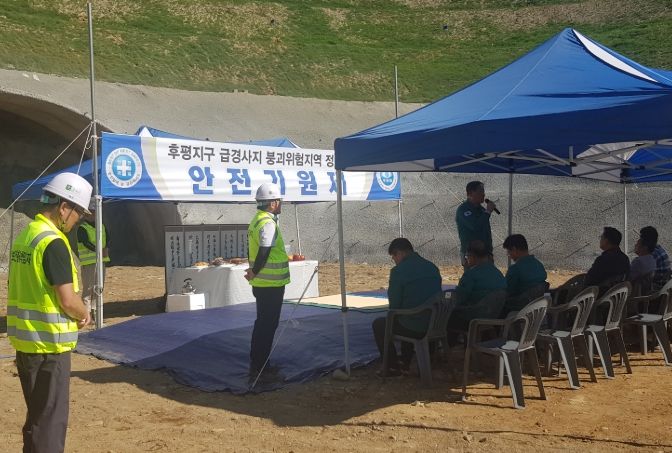 (아름다운교육신문) 평창군은 급경사지 붕괴 위험지역을 정비하기 위한 터널공사를 후평리에서 계장리 일원에 추진 중으로 7월 10일, 현장에서 무사 완공과 공사 관계자들의 안전을 기원하는 안전기원제를 시공사 주관으로 개최했다.