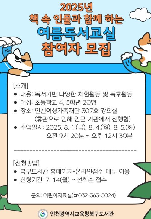 (아름다운교육신문) 인천광역시교육청북구도서관은 여름방학을 맞아 초등학교 4·5학년을 대상으로 8월 1일부터 5일까지 3일간 ‘여름독서교실’을 운영한다.