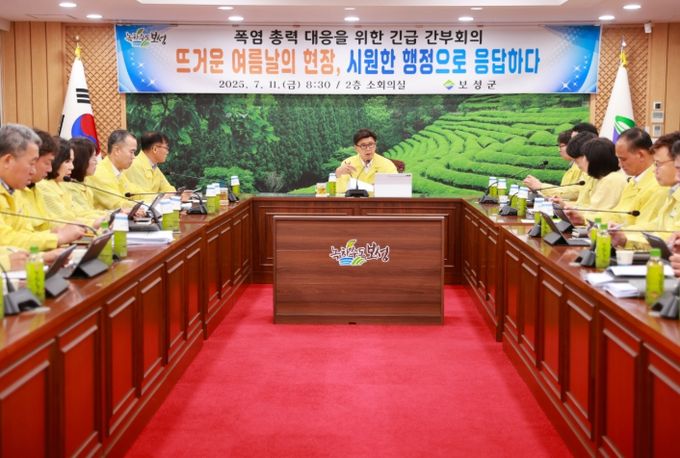 (아름다운교육신문) 보성군은 11일 오전 군청 2층 소회의실에서 전 실과소장이 참석한 가운데, ‘폭염 총력 대응을 위한 긴급 간부회의’를 열고, 전날 이재명 대통령의 “기록적 폭염에 가용한 행정력을 총동원해달라”는 당부에 신속히 호응했다.