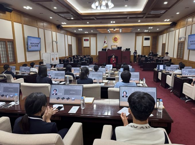 오전에는 대구시의회 본회의장에서 청소년 모의의회를 운영하여 의장단을 선출하고 안건을 상정·토론·표결하는 과정을 체험했다.